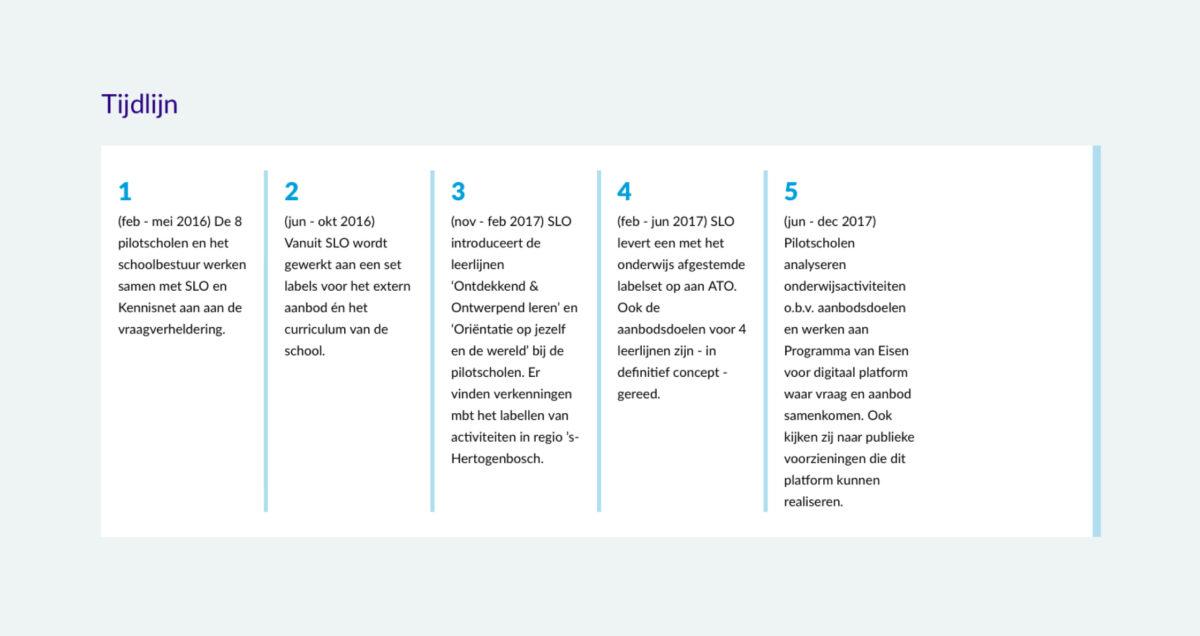 Ik geef een willekeurig voorbeeld uit de praktijk. Voor een van de websites waarvoor ik werd ingehuurd als copywriter was een tijdlijn ontworpen. Maar waar je in de koppen jaartallen of een datum zou verwachten, is gekozen voor nummers. Ironisch genoeg is er in de koppen van de tijdlijn nu geen plek meer voor dat waar een tijdlijn om draait: een tijdsperiode. De data zijn daarom noodgedwongen in het contentveld ingevoerd. Zo moet je met content het design fixen. Dat had niet gehoeven als de designer had gewerkt met echte content.